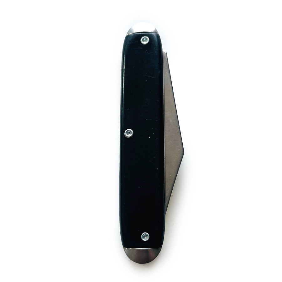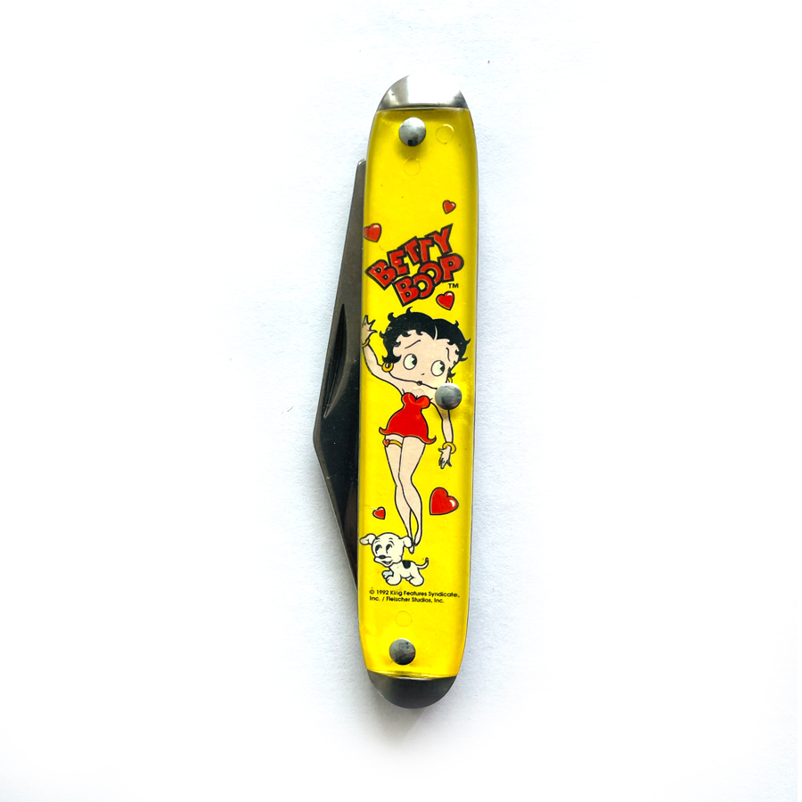 This sweet little vintage pocket knife is marked 1992 and features Betty Boop and her dog Pudgy (who was introduced in 1934). The knife is in decent used condition with some obvious signs of wear and age. Overall, it’s in good shape. The blade is sharp and the open/close hinge feels sturdy. This was intended as a novelty, maybe for kids, and was never meant to be super high quality cutlery. But it’s not bad as a little knife. It is approximately 3.5″ closed and just under 6″ open.