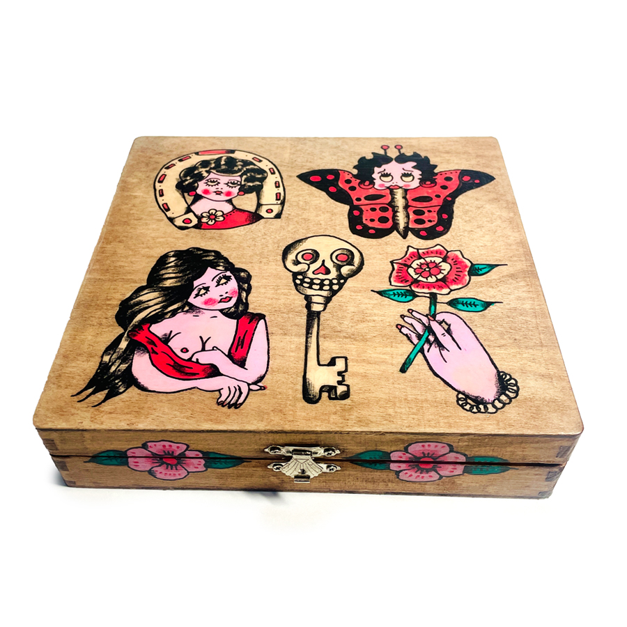 This original one of a kind hand-painted wooden box features tattoo flash drawings by @dtristman. It was painted with a combination of matte water-based paint and colored pencil and is coated in a low gloss sealant so that it’s protected from smudges and is smooth to the touch. The box is approximately 8″ x8″ by 2″ and has hinges in the back and a clasp in the front.